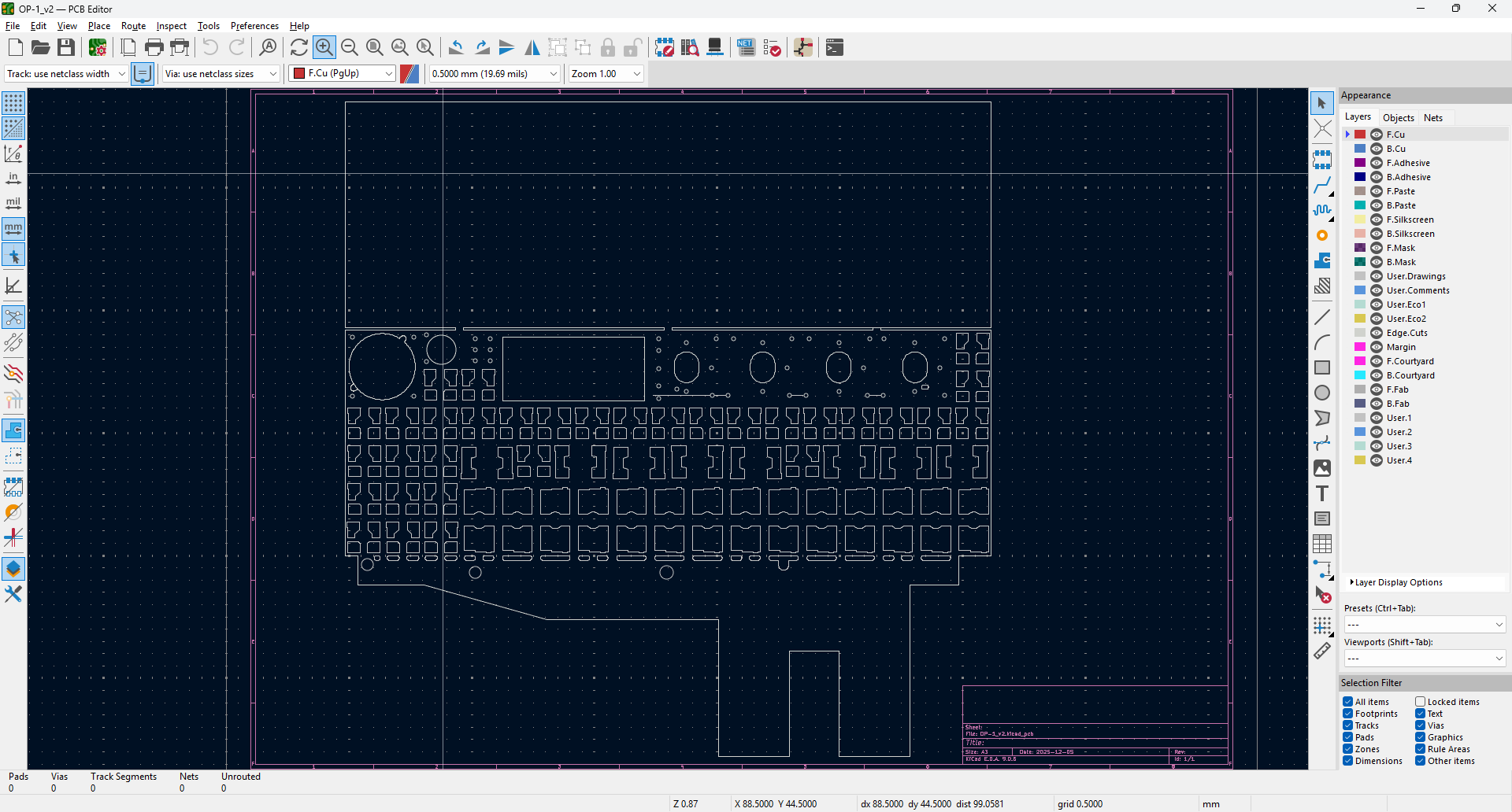 My pc is still in shipment but should be here tomorrow or the day after. I will share the kicad files on GitHub so we can collaborate on it. I think I have the basic measurements of the pcb down now and am currently working on the cutouts of the individual rows/buttons and would love some help since I’m a little slow with the move and everything.