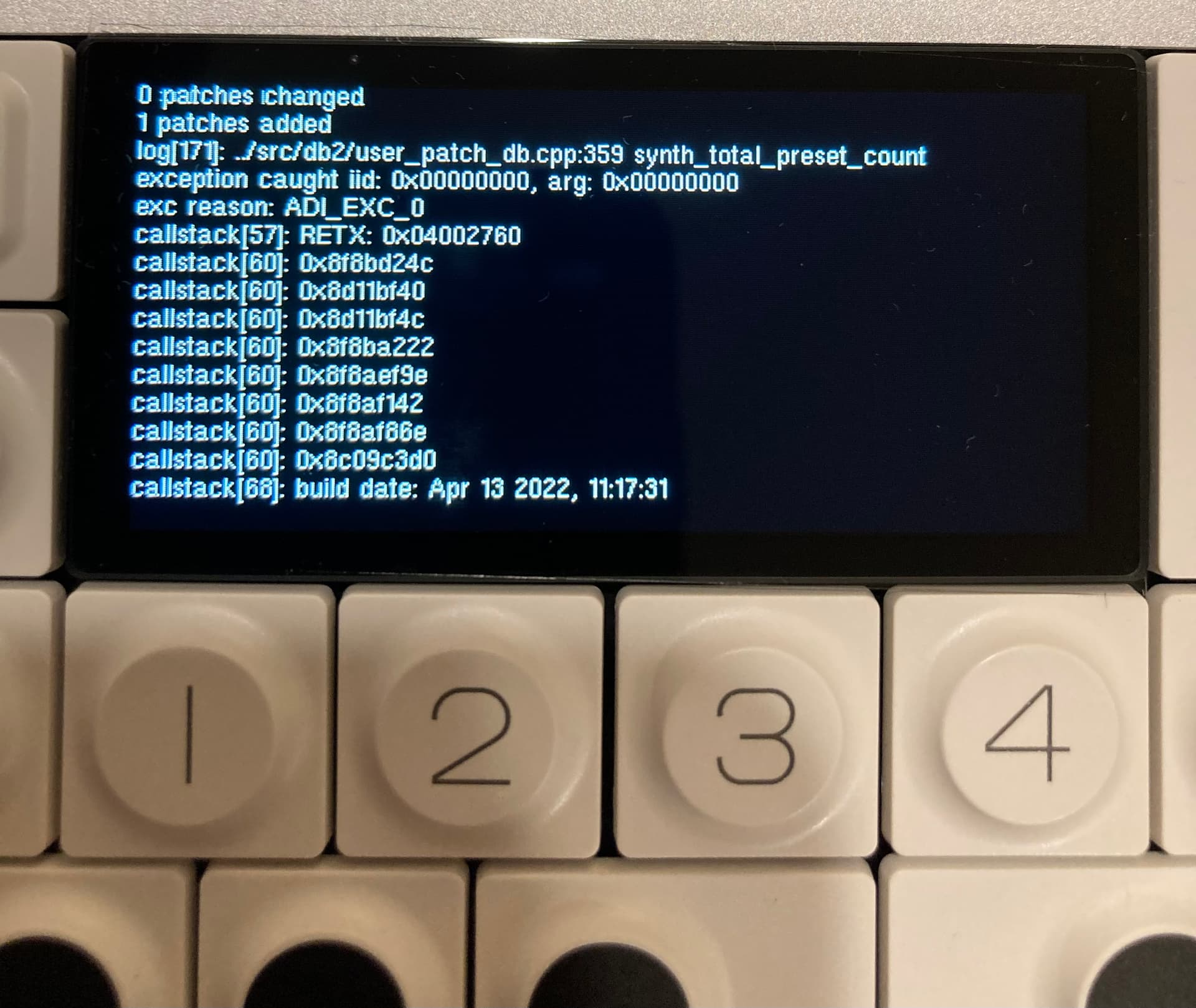 It wonāt save snapshots, or it takes me about 40 or 50 sample saving attempts literally before it will save one snapshot. Until I can finally get one to save, the snap shot will immediately revert back to whatever synth sound it was on previously in the sampler. Itās just too frustrating and ridiculous considering that this thing should work 100% upon arrival and the sampling capabilities are pretty much half of the appeal of this instrument. Also, I can drag the very few snapshots that I was able to get onto my desktop but as soon as I try to drag one of these snapshots from my desktop back onto the OP one it crashes and freezes and displays all of this code.