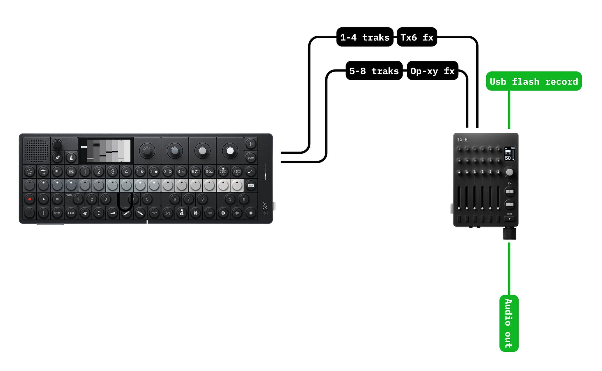 This way, I could process one group of tracks with the OP-XY’s internal effects, and process the other group with the mixer’s effects, and then mix them together.