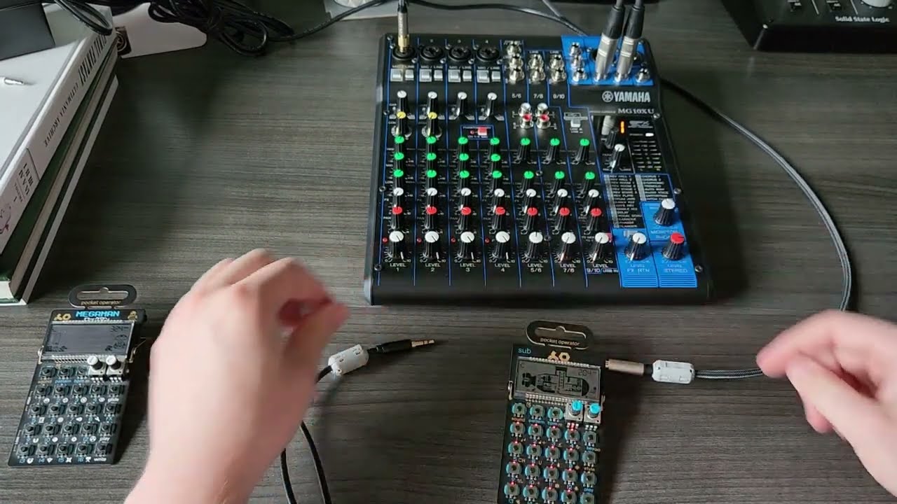 I’m not daisy-chaining the PO’s, so that I can mix them more naturally; I’m using a p0k3t0_41 to split the master PO’s sync and audio signals, duplicating the sync signal, and sending each PO to their own mixer channel like so (forgive my crude diagram):